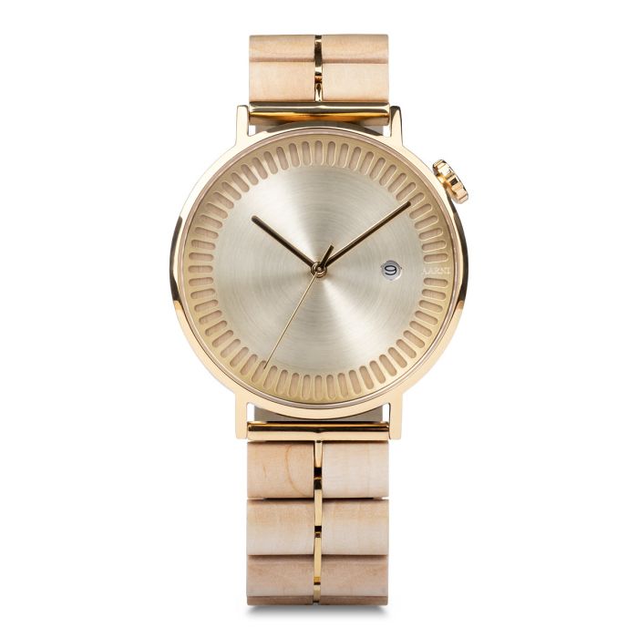 Kellon kuori on valmistettu teräksesta, jossa on kullanvärinen pinnoite ja kellon ranneke on koivua. Kauniin kokonaisuuden yhdistää rannekkeen ohut kullanvärinen raita ja kellotaulun hillitty kuviointi yhdessä vaalean puun kanssa. Tarkemmin kellon toimintaa ja Miyota 9015 automaattikoneiston yksityiskohtia pääsee ihailemaan takapohjan safiirilasin läpi. Käyntivara on 42h.