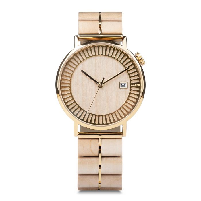 Kellon kuori on valmistettu teräksesta, jossa on kullanvärinen pinnoite ja kellon ranneke on koivua. Kauniin kokonaisuuden yhdistää rannekkeen ohut kullanvärinen raita ja kellotaulun hillitty kuviointi yhdessä vaalean puun kanssa. Tarkemmin kellon toimintaa ja Miyota 9015 automaattikoneiston yksityiskohtia pääsee ihailemaan takapohjan safiirilasin läpi. Käyntivara on 42h.