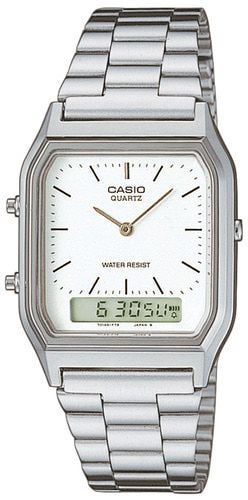 Teräksinen Casio Retro -rannekello valkoisella kellotaululla. Kellossa on sekä analoginen että digitaalinen ajannäyttö.