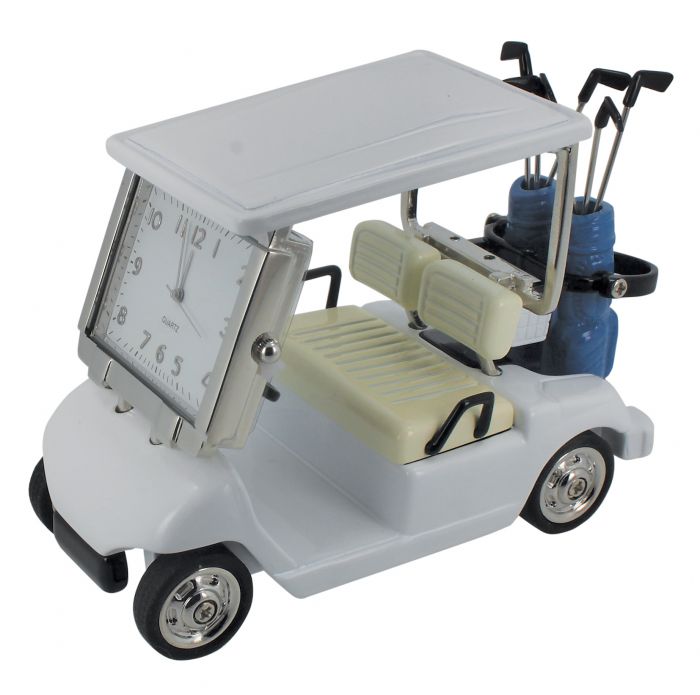 Valkoinen, golfkärryä esittävä pöytäkello. Kärryn etuikkunan tilalla on kantikas, valkoinen kellotaulu hopeanvärisillä numeroilla ja osoittimilla. Kello on paristokäyttöinen. Golfkärry on 7 cm ja 9,7 cm.