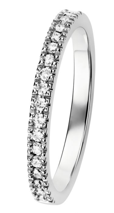 14 karaatin valkokullasta valmistettu Kohinoor Valerie -timanttisormus. Tukevarunkoisessa rivisormuksessa säkenöi kauniisti yhteensä 18 briljanttihiottua timanttia