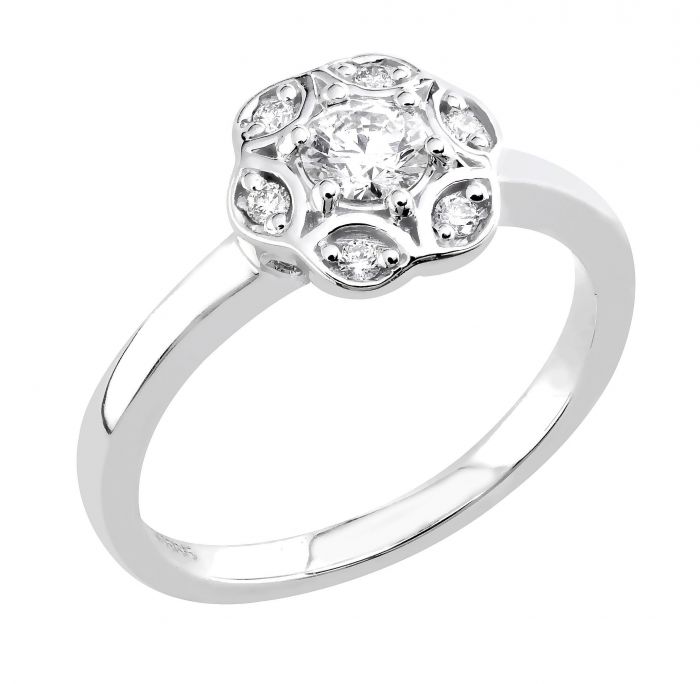 Kaunis vintage-henkinen Destiny -timanttisormus tukevalla, mutta sirolla rungolla. Runko on myös ns. comfort fit -mallia eli se on pyöristetty sisäpuolelta. Tämän ansiosta sormus tuntuu sormessa miellyttävältä ja pehmeältä. Halo -mallisessa sormuksessa yhdistyy 1900-luvun alkupuolen romanttinen muotokieli ja tämän päivän moderni korumuotoilu. Sormuksessa on siro puolipyöreä runko. Naiselliseen ja siroon timanttisormukseen on istutettu 7 kauniisti säihkyvää timanttia. Timanttien väri on H(wesselton, väritön) js puhtaus on Si (ei silmin havaittavia sulkeumia).