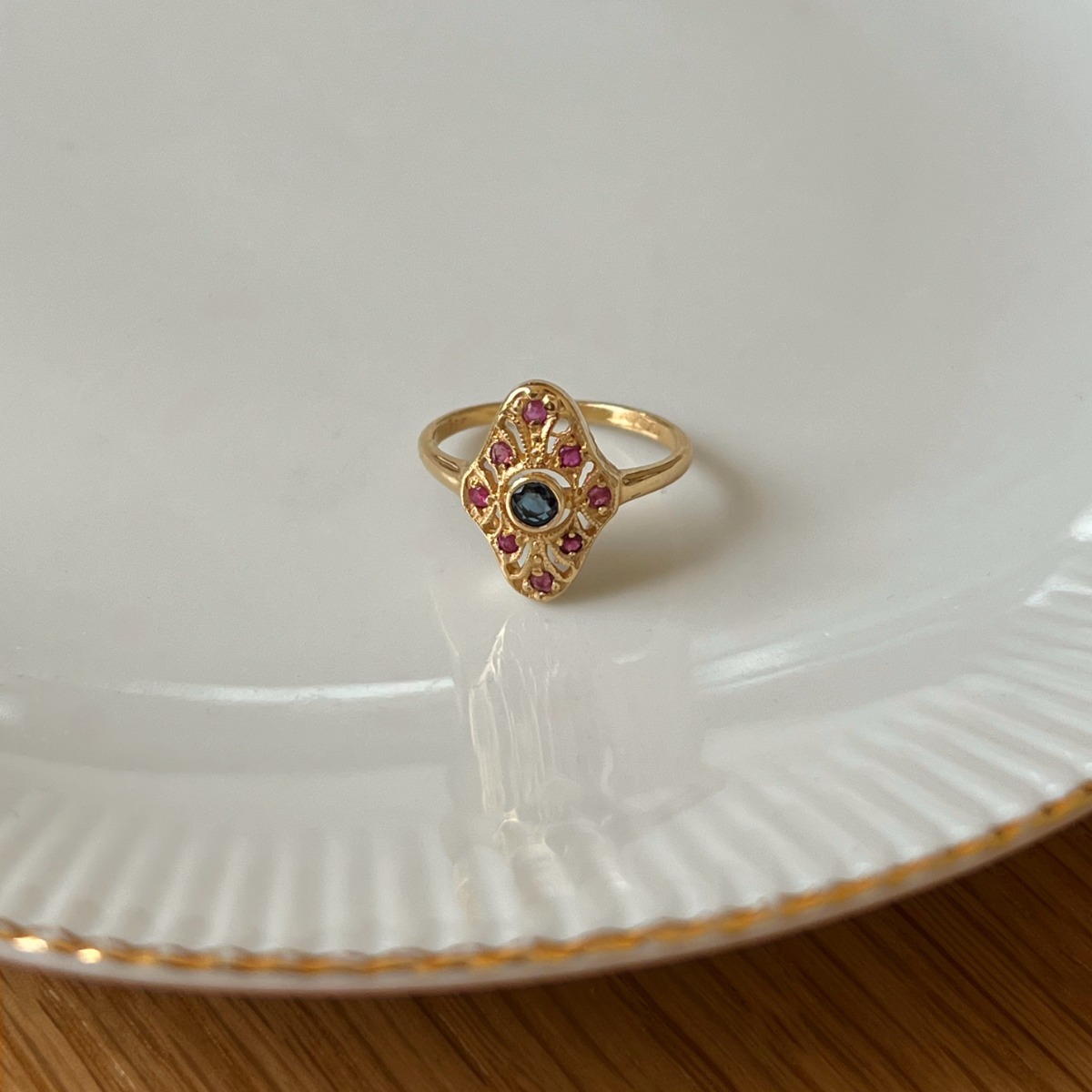 Tämän kultaisen, safiirin ja rubiinein koristellun second hand -sormuksen arvo on 990 euroa.