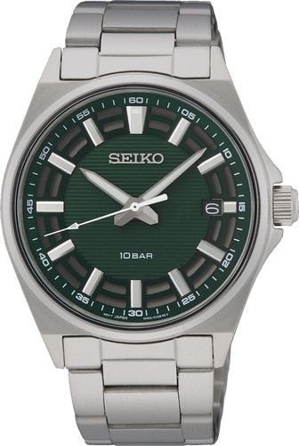 Seikon miesten rannekello teräskuorella ja -rannekkeella. Vihreänsävyisestä kellotaulusta löytyy Lumibrite-pinnoitetut pimeässä hohtavat osoittimet ja indeksit, sekä päivyri.
